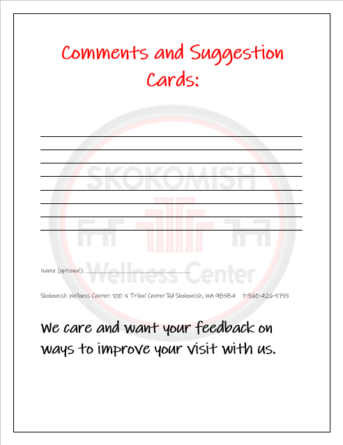 The foundation and heart of our services are centered on the patient and all users of our services. This includes reasonable access, a commitment to excellence, a compassionate respectful attitude and full involvement of patient and family in a teamwork wellness model of care. The Skokomish Health Center develops responsive, cost-effective, high-quality health care services that meet the needs of the community members. Services are provided in a fair, confidential, professional atmosphere in a clean and safe facility.